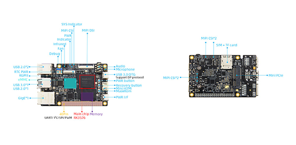 4. Onboard Gigabit Ethernet Port, RGMII, USB3.0/2.0, Mini PCLE, Mini HDMI, MIPI screen at MIPI camera at iba pang mga interface ng peripheral, na humahantong sa 40pin na hindi nagamit na mga pin, mayaman na mga interface ng pagpapalawak upang matugunan ang higit pang mga pangangailangan sa pag -unlad!